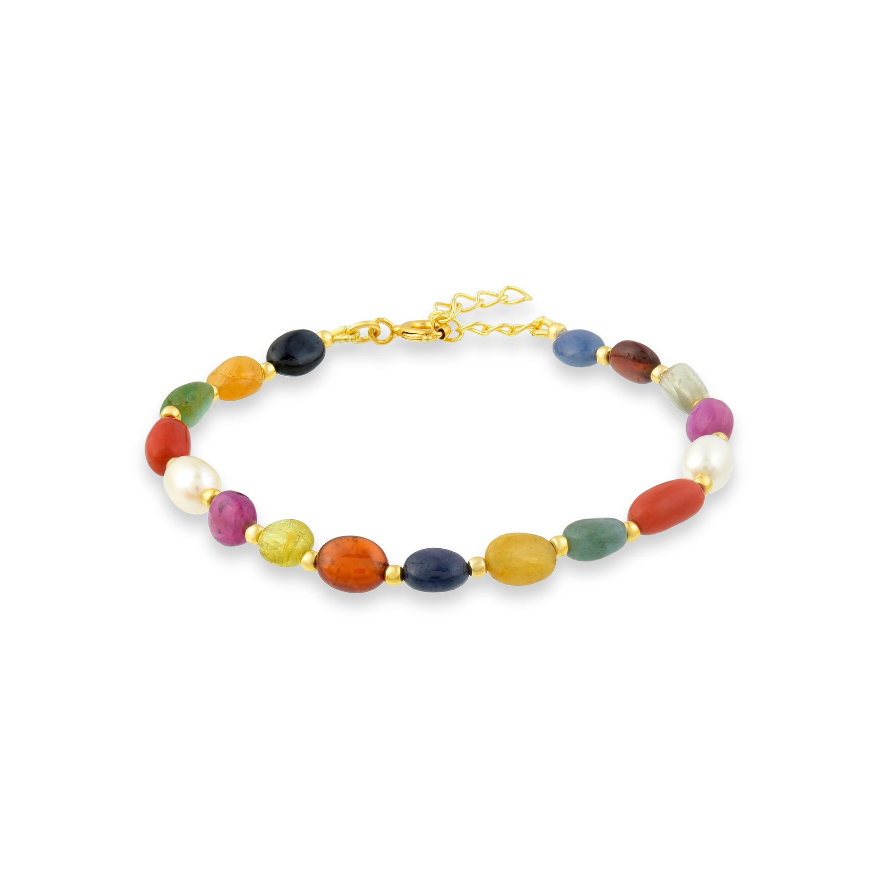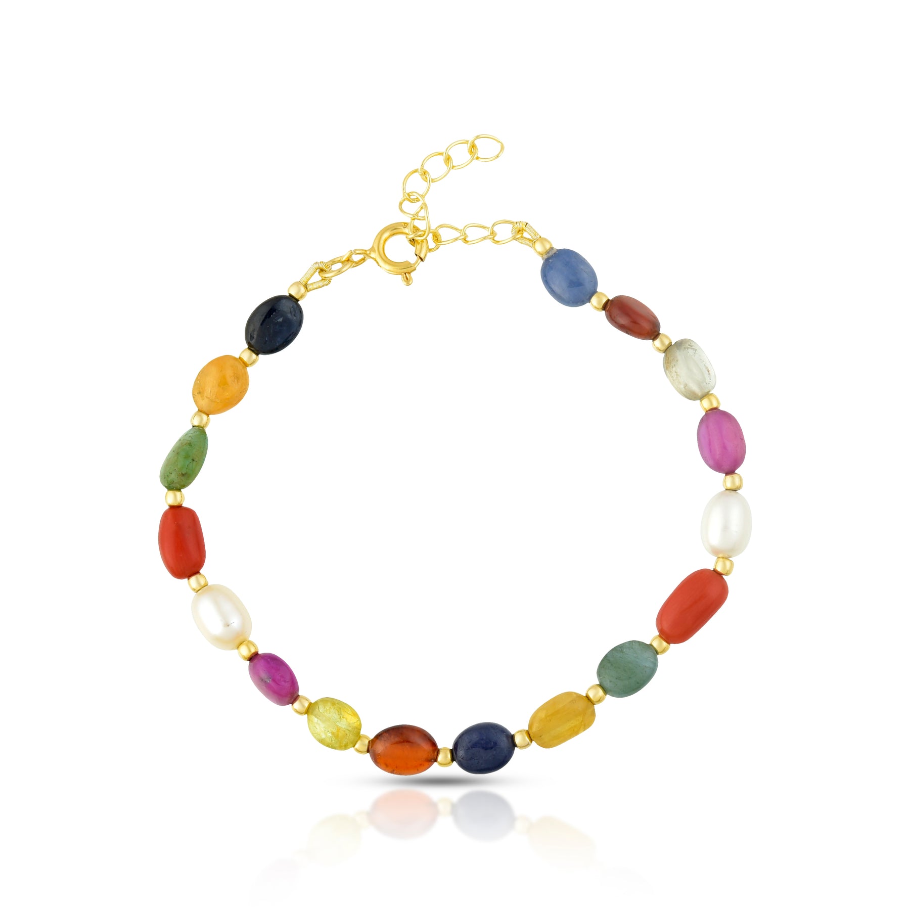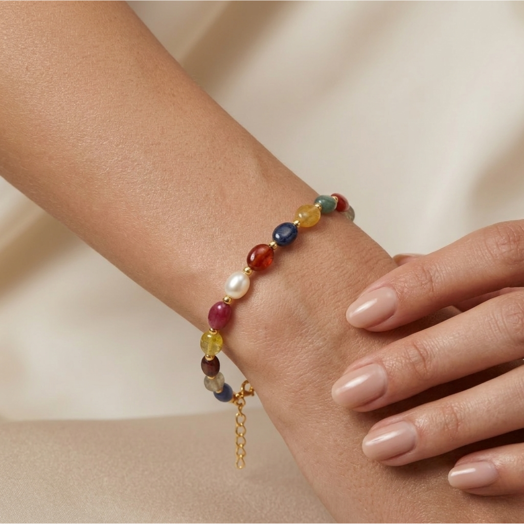 A vibrant Navratna bracelet featuring nine sacred gemstones traditionally associated with balance, positivity, and planetary harmony. This piece includes stones such as ruby, emerald, yellow sapphire, blue sapphire, coral, pearl, hessonite, and cat’s eye, each believed to carry its own unique energy and symbolism.